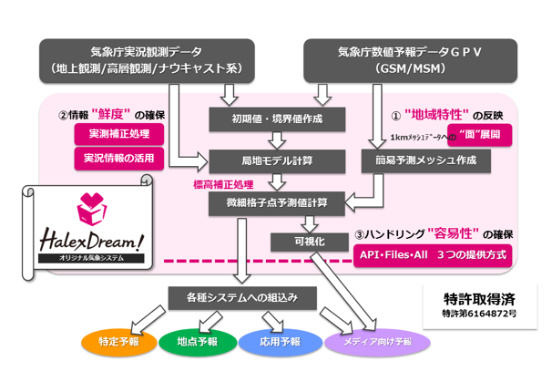 高精細データ加工技術HalexDream!では、気象庁から発表される実況観測データ・数値予報データ等あらゆるデータを取り込み、独自処理を行っています。 ①地域特性を反映し、1kmメッシュ格子毎の標高補正処理 ②情報の”鮮度”を確保するための、実況情報を活用した実測補正処理と1日48回のデータ更新 ③お客様側でのデータ処理のし扱いやすさを実現するため、パッケージ化して提供 (特許取得済:詳しくはこちらをご覧ください。) |