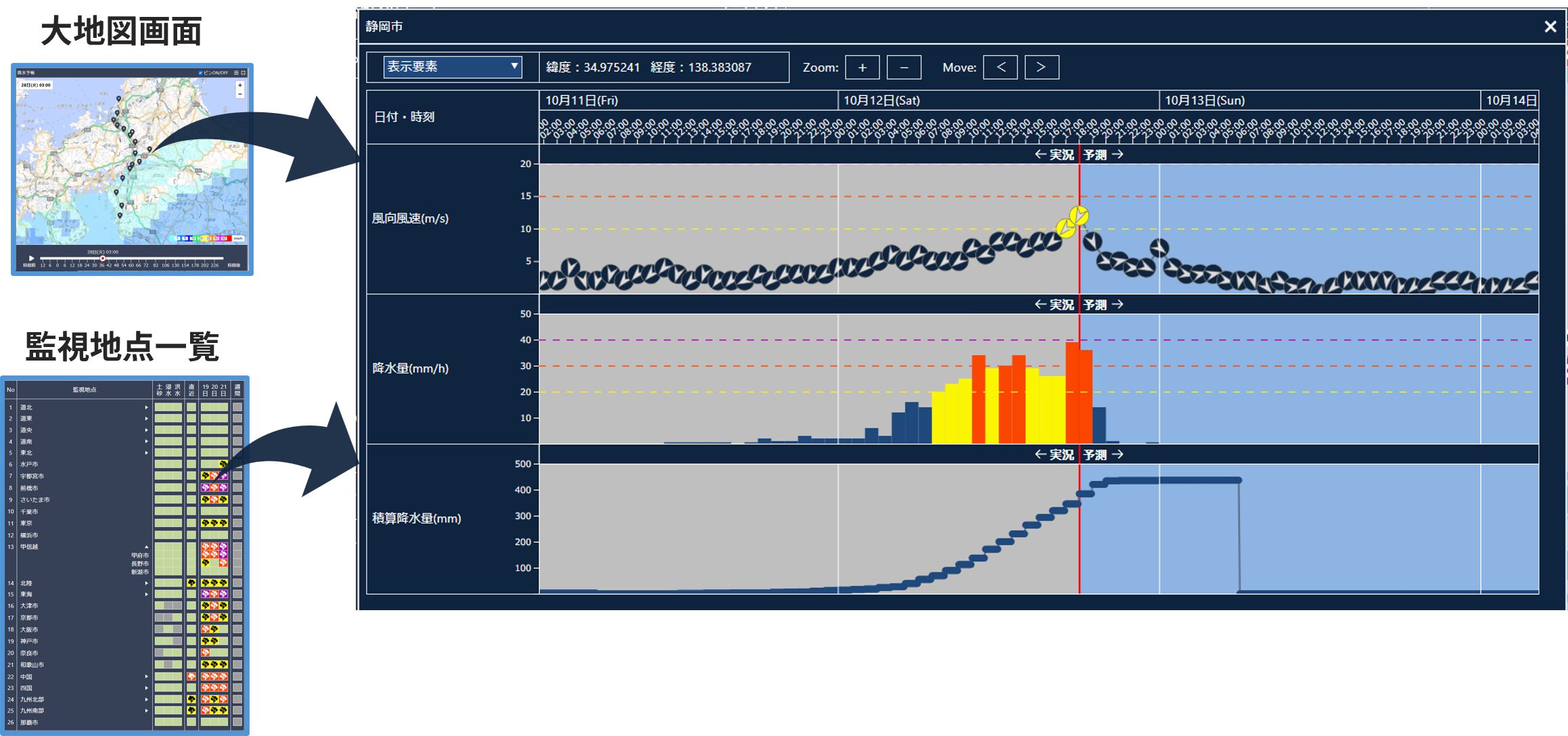 監視地点や地図上で選択した地点の気象災害リスク変化を時系列で確認できます。