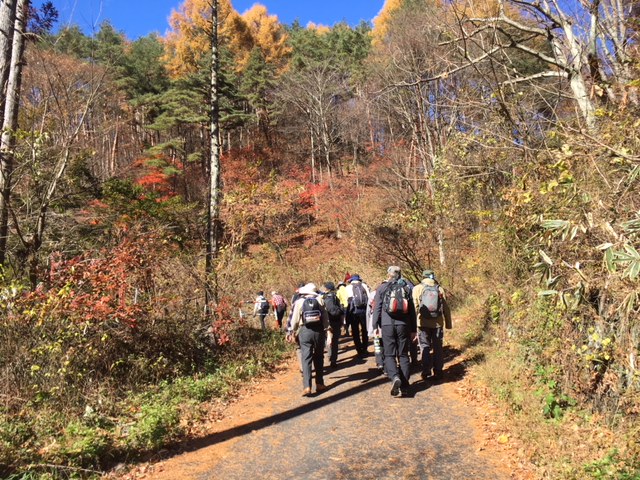 いつものように池袋駅西口に午前8時に集合。すっかり顔馴染みになった“いつものメンバー”と1ヶ月ぶりの再会です。池袋駅西口を出た観光バスは中央自動車道を西へ。この日の街道歩きの出発地、岡谷を目指します。1ヶ月前と比べるとすっかり秋めいて、中央自動車道の沿線も紅葉が進んでいます。今年はこのところ大陸(北)から寒気が流れ込んできて急激に寒くなったせいか、紅葉の色付きが例年よりもいい感じです。その紅葉目当てにこの週末は多くの観光客が紅葉狩りに出掛けるのか、中央自動車道の交通量は普段より多目。加えて、途中、小仏トンネル付近で発生した事故により渋滞が発生。岡谷まで3時間ほどで到着する予定が約4時間半もかかってしまいました。