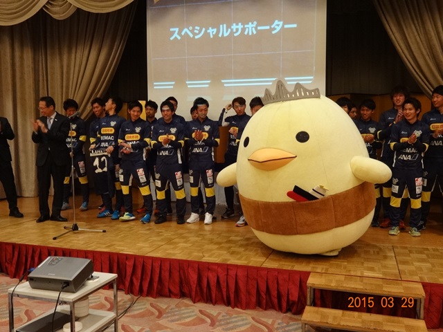 パーティーは岡田オーナーの挨拶にはじまり、木村監督、さらには選手の代表から今シーズンにかける力強い決意・覚悟の表明がありました。続いて、応援キャラクターの発表があり、今や全国区となった“ゆるキャラ”の『バリィさん』が場内に登場しました。第2回の「ゆるキャラグランプリ」で優勝したバリィさんは、ここ今治市で誕生したキャラクターです。昨シーズンまでエンブレムとしてチームのシンボルを担ってきた『バリィさん』ですが、チームのエンブレムが伊予水軍の紋章に変わったことで、応援キャラクターに就任することになりました。いきなり、「ゆるキャラグランプリ」に優勝した全国レベルのキャラクターが応援キャラクターに就任です(^-^)v
