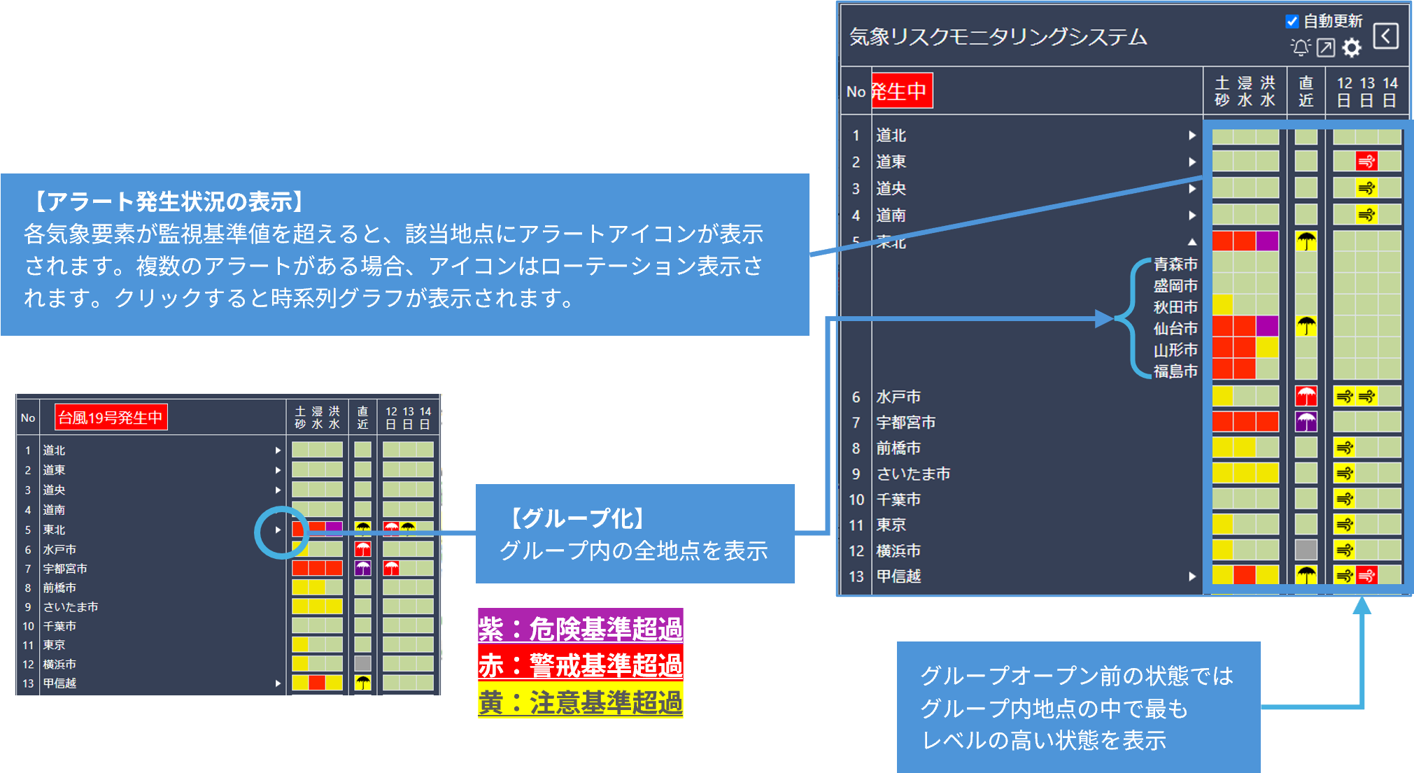 設定した監視地点に迫る気象災害リスクを、リストと地図で表示。 |