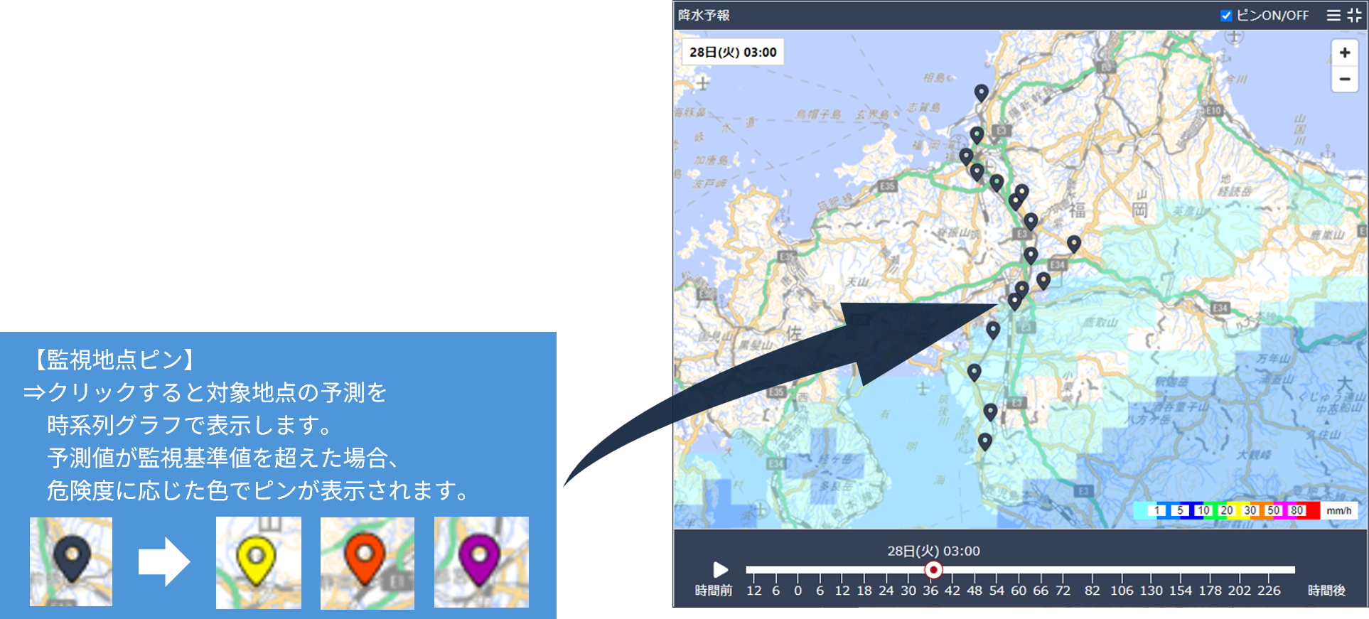監視地点や地図上で選択した地点の気象災害リスク変化を時系列で確認できます。